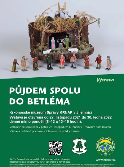 Vernisáž se nakonec ruší! Krkonošské muzeum Správy KRNAP v Jilemnici pořádá výstavu Půjdem spolu do betléma. Jedná se o výstavu betlémů pocházejících nejen ze sbírky muzea. Vernisáž se uskuteční v pátek 26. listopadu v 17 hodin v Erbovním sále muzea.
