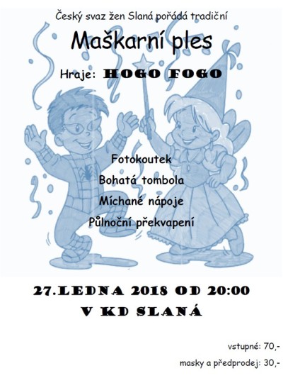 Český svaz žen Slaná pořádá tradiční maškarní ples. Hrát bude kapela Hogo fogo. Nebude chybět fotokoutek, bohatá tombola, míchané nápoje nebo půlnoční překvapení. Koná se v sobotu 27. ledna od 20 hodin v Kulturním domě Slaná. Vstupné 70 Kč, masky a předprodej 30 Kč. Samostatná pozvánka