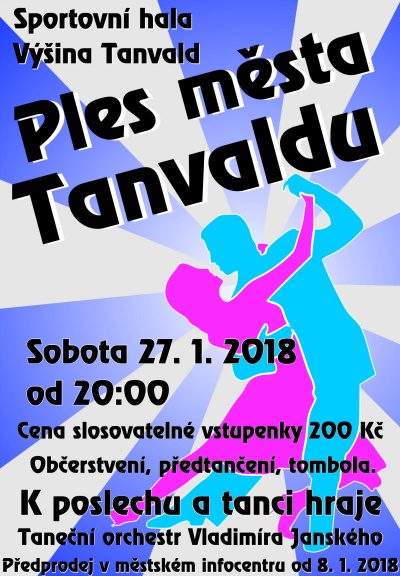 Ve Sportovní hale Výšina Tanvald se koná v sobotu 27. ledna od 20 hodin městský ples. K poslechu a tanci bude hrát Taneční orchestr Vladimíra Janského. Nebude chybět občerstvení, předtančení a tombola. Cena slosovatelné vstupenky je 200 Kč. Předprodej vstupenek v městském infocentru od 8. 1. 2018. Samostatná pozvánka