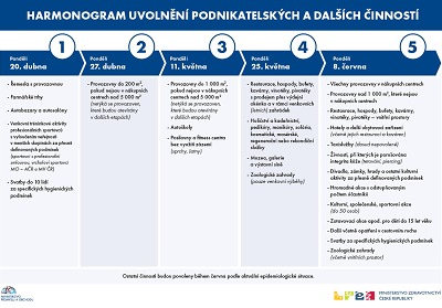 „Nejprve by měli otevřít řemeslníci, farmářské trhy a autobazary, postupně by se měly každý týden a později po 14 dnech přidávat další obchody či akce. V poslední vlně by mohly otevřít například všechny provozovny v nákupních centrech," oznámil novinářům vicepremiér Karel Havlíček. Podrobný harmonogram v samostatném článku zde
