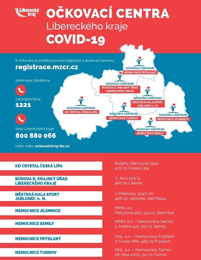 Zájemci o vakcínu z řad seniorů 80+ a od pondělí i 70+ se mohou po registraci a rezervaci nechat naočkovat proti covid-19 v Liberci, Jablonci nad Nisou, České Lípě, Jilemnici a Semilech. Nově od pondělí 1. března to bude možné také na očkovacích místech v nemocnicích v Turnově a Frýdlantu.