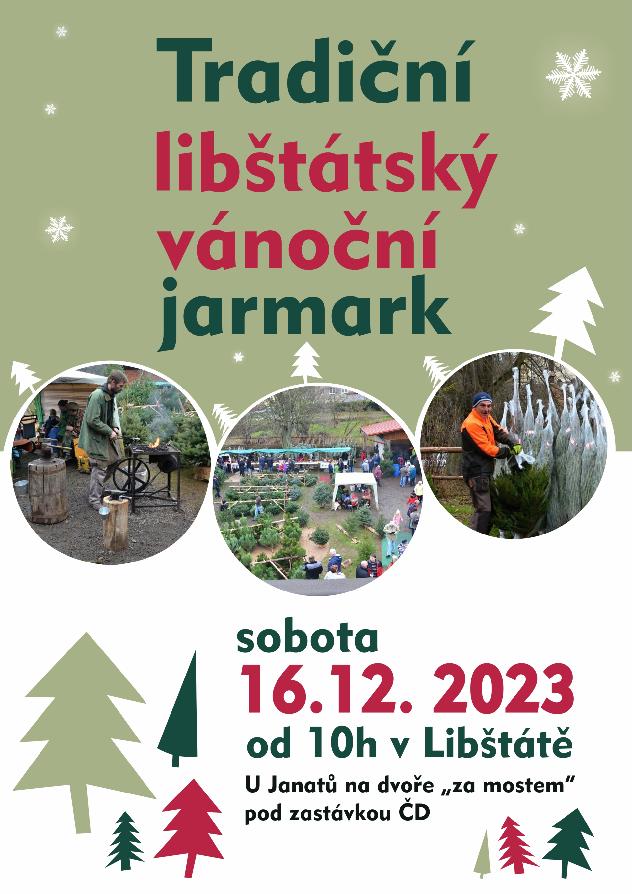 Již 17. ročník Libštátského vánočního jarmarku se koná v sobotu 16. prosince U Janatů na dvoře pod zastávkou ČD. Jste zváni na tradiční vánoční výrobky či ozdoby. Též bude zajištěno bohaté občerstvení - kérkonošské sejkory, grilované maso, klobásy, pro zahřátí svařáček, punč, grog. Cák poudám - přiďte pobejt a nasát předvánoční atmosféru.