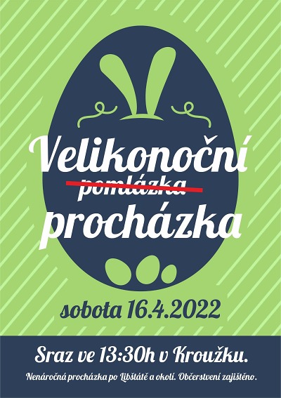 V Libštátě připravili opět na sobotu 16. dubna Velikonoční procházku. Sraz účastníků je v Kroužku ve 13:30. Trasu ještě upřesní, ale půjde o nenáročnou procházku v okolí Libštátu. Vhodné i pro děti, starší a pokročilé i kočárkáře, pejsky, prostě pro všechny. Občerstvení pořadatelé připraví, ale vzít si drink do batůžku neuškodí.