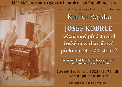 Hudební pořad pedagoga Radka Rejška nazvaný Josef Kobrle - významný představitel českého varhanářství přelomu 19. - 20. století, doplněný o hudební ukázky hry na varhany z dílny a produkce Kobrleho firmy, se koná ve čtvrtek 16. června 2022 od 17 hodin ve vstupní hale lomnického muzea.