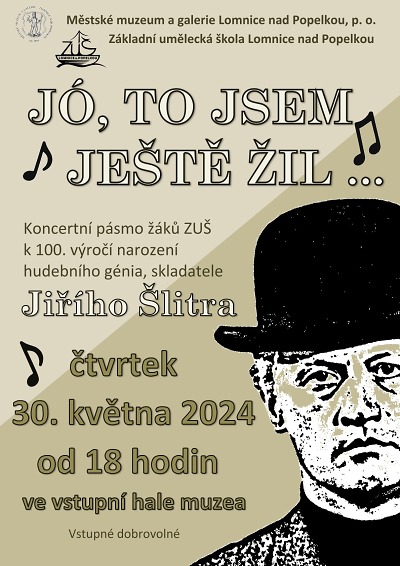 Koncert žáků hudebního oboru Základní umělecké školy v Lomnici nad Popelkou se uskuteční ve čtvrtek 30. května v 18 hodin pod výstižným názvem Jó, to jsem ještě žil... Jak sám název napovídá, půjde o pásmo k 100. výročí narození významného hudebního skladatele Jiřího Šlitra, rodáka z nedaleké Zálesní Lhoty.