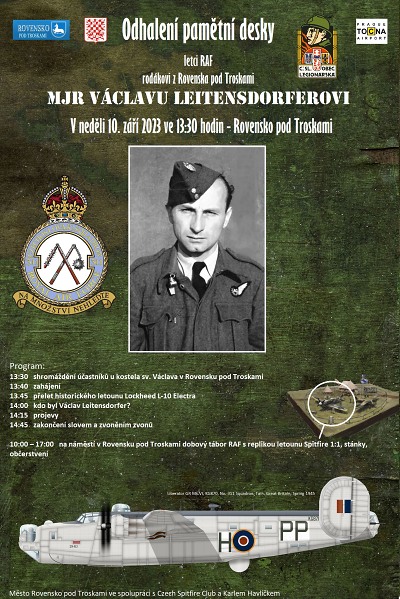 V neděli 10. září v Rovensku pod Troskami vzdají odhalením pamětní desky hold tamnímu rodákovi Václavu Leitensdorferovi, letci RAF, který během druhé světové války podnikl celkem 53 operačních letů v trvání 578,03 hodin!
