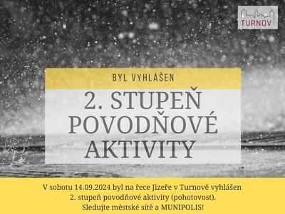 Na řece Jizeře v Turnově byl vyhlášen 2. stupeň povodňové aktivity (pohotovost). Žádáme obyvatele a majitele nemovitostí v blízkosti toku Jizery, aby vyklidili garáže a další přízemní prostory. Doporučujeme především obyvatelům nejníže položených míst - Dolánky, Loužek, Nudvojovice, aby se preventivně připravili na možnou záplavu, ostatní území města zatím ohroženo není. Situace se rychle mění, zatím se předpokládá setrvalý stav nebo i mírný pokles v průběhu odpoledne. O další situaci budete informováni rozhlasem, webovým zpravodajstvím a aplikací MUNIPOLIS.