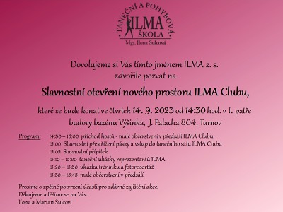 Ve čtvrtek 14. září od 14:30 bude slavnostně přestřižena páska při otevření nově zrekonstruovaného prostoru zrcadlového sálku v budově bazénu Výšinka, J. Palacha 804, Turnov pro tanečníky a sportovce Taneční a pohybové školy ILMA, tzv. ILMA Club.