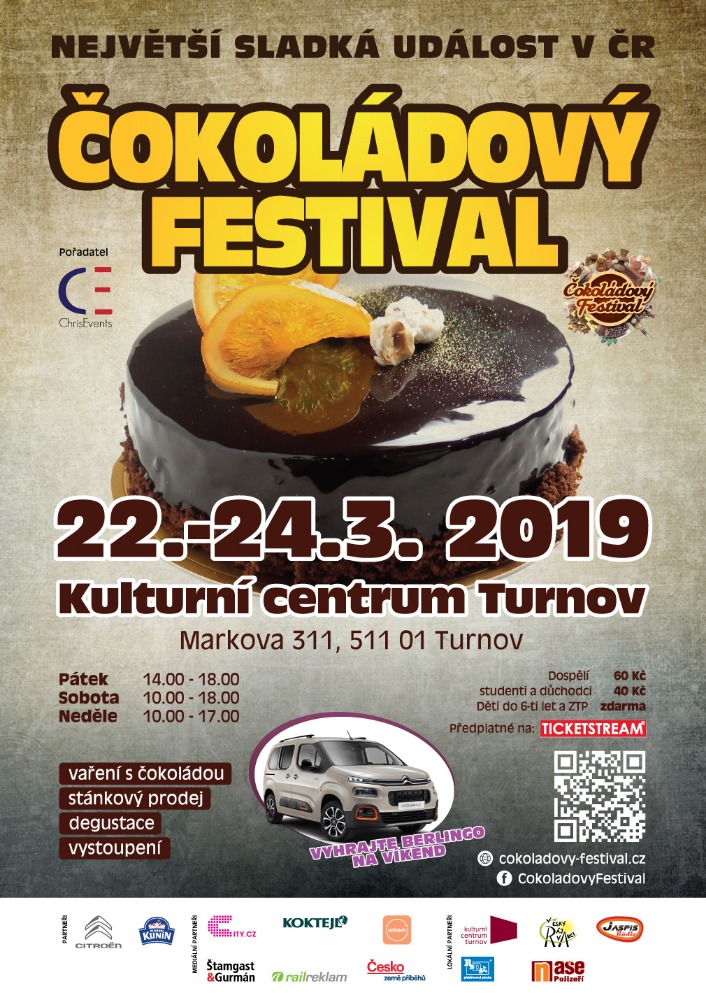 Čokoládový Festival 2019 v Turnově pořádaný agenturou ChrisEvents je jedinečnou událostí pro všechny milovníky čokolády a cukrovinek, kteří mají chuť se pobavit, pochutnat si a případně se i přiučit vaření s čokoládou.