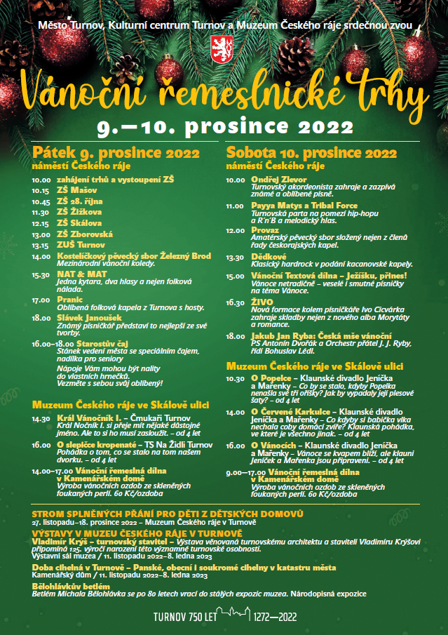 Vánoční řemeslnické trhy 2022 - skvělí řemeslníci z celé České republiky, poutavý hudební i divadelní program, dětská vystoupení a pravá adventní atmosféra. Město Turnov, Kulturní centrum Turnov a Muzeum Českého ráje v Turnově Vás srdečnou zvou na obnovenou tradici, kterou si nechá ujít málokterý obyvatel Turnova nebo jeho návštěvník. Trhy na náměstí Českého ráje budou slavnostně zahájeny v pátek 9. prosince v 10 hodin, uzavře je Česká mše vánoční J. J. Ryby v sobotu 10. prosince od 18 hodin.