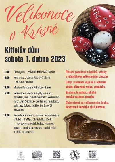 Velikonoce na Krásné se konají v sobotu 1. dubna. Program je naplánován ve vnitřních prostorách Kittelova domu. Kromě rukodělných velikonočních předmětů, pomlázek a dobrot jsou připraveny dílny, kdy si návštěvníci budou moci zkusit například zdobení vajec apod.
