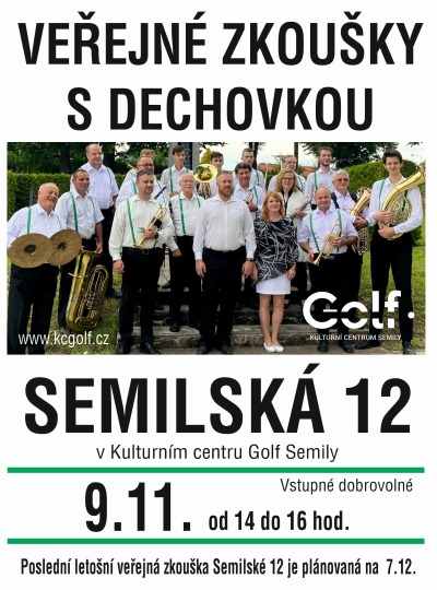 Můžete se stát prvními posluchači a zpříjemnit si s dobrou dechovkou sobotní odpoledne. Pro zájemce o tanec je k dispozici taneční parket. Další veřejná zkouška Semilské 12 bude 7.12.