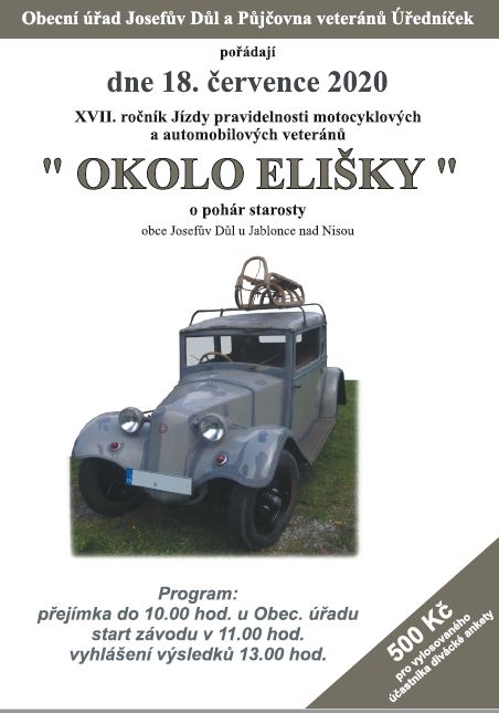 V sobotu 18. července se koná v Josefově Dole 17. ročník populárního závodu veteránů Okolo Elišky. Přejímka vozů bude probíhat do 10 hodin u obecního úřadu v Josefově Dole. Start závodu v 11 hodin, vyhlášení závodu ve 13 hodin.