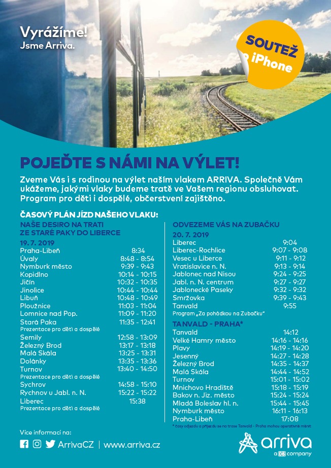 V pátek 19. července a v sobotu 20. července se na Liberecku představí se svým vlakem společnost Arriva, která tu letos v prosinci nahradí na některých osobních vlacích a rychlících České dráhy. Při prezentační jízdě bude Arriva vozit cestující zdarma a vlak si mohou přijít prohlédnout i zájemci o práci stevardů či strojvedoucích. Na Liberecko přijede Arriva s nízkopodlažním klimatizovaným vlakem Siemens Desiro.