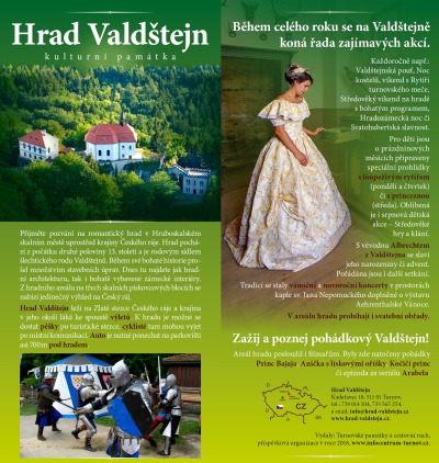 Nový leták hradu Valdštejn má sloužit jako upoutávka k návštěvě romantického hradu v Hruboskalském skalním městě uprostřed krajiny Českého ráje a zve návštěvníky na řadu zajímavých akcí, které se na pohádkovém Valdštejně konají během celého roku.