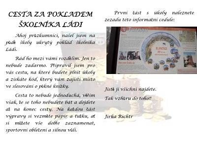 Ahoj průzkumníci, našel jsem na půdě školy ukrytý poklad školníka Ládi. Rád ho mezi vámi rozdělím. Jen to nebude zadarmo. Připravil jsem pro vás cestu, na které budete plnit úkoly a získáte kód, který vám zajistí místo ve slosování o pěkné knížky. Cesta to nebude jednoduchá, věřím však, že se toho nebudete bát a dojdete až na konec cesty. Na každou část výpravy si vezměte papír a tužku, ať si můžete vše dobře zaznamenat, sportovní oblečení a silnou vůli. První část s úkoly naleznete zezadu této informační cedule: Jistě ji všichni najdete.
