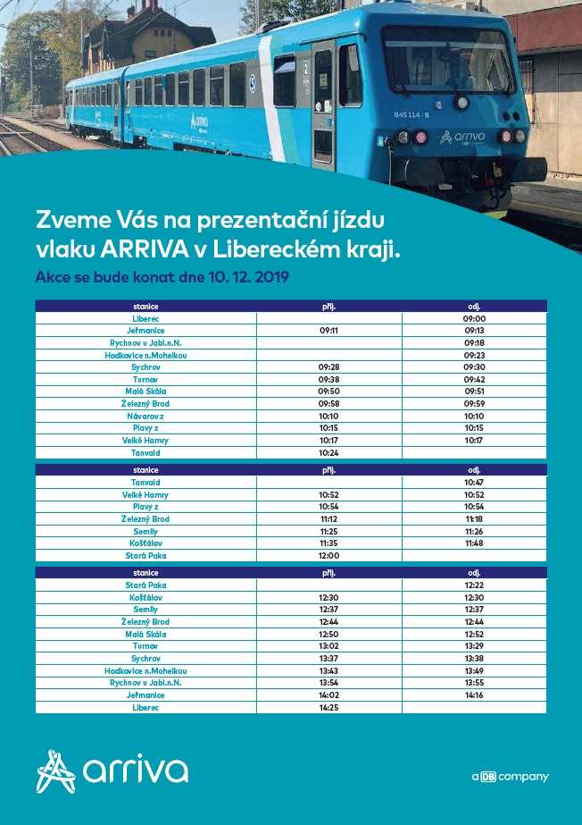 Prezentační jízda vlaku Arriva bude probíhat v úterý 10. prosince na trati Liberec - Tanvald - Stará Paka - Liberec. Od 15. prosince bude právě těmito vlaky společnost Arriva zajišťovat provoz osobních vlaků a rychlíků na Liberecku. Podrobný rozpis jízdy naleznete v příloze.